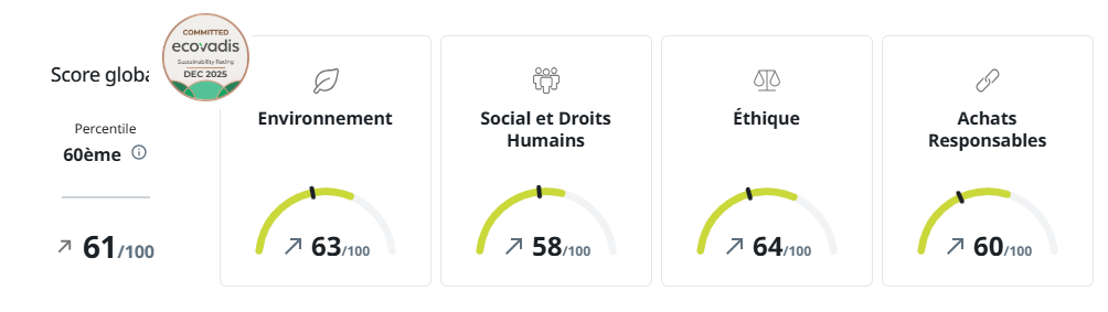 Nous sommes fiers de partager notre tout dernier score EcoVadis 2025 : 61/100, soit une progression significative de 11 points par rapport à 2024.